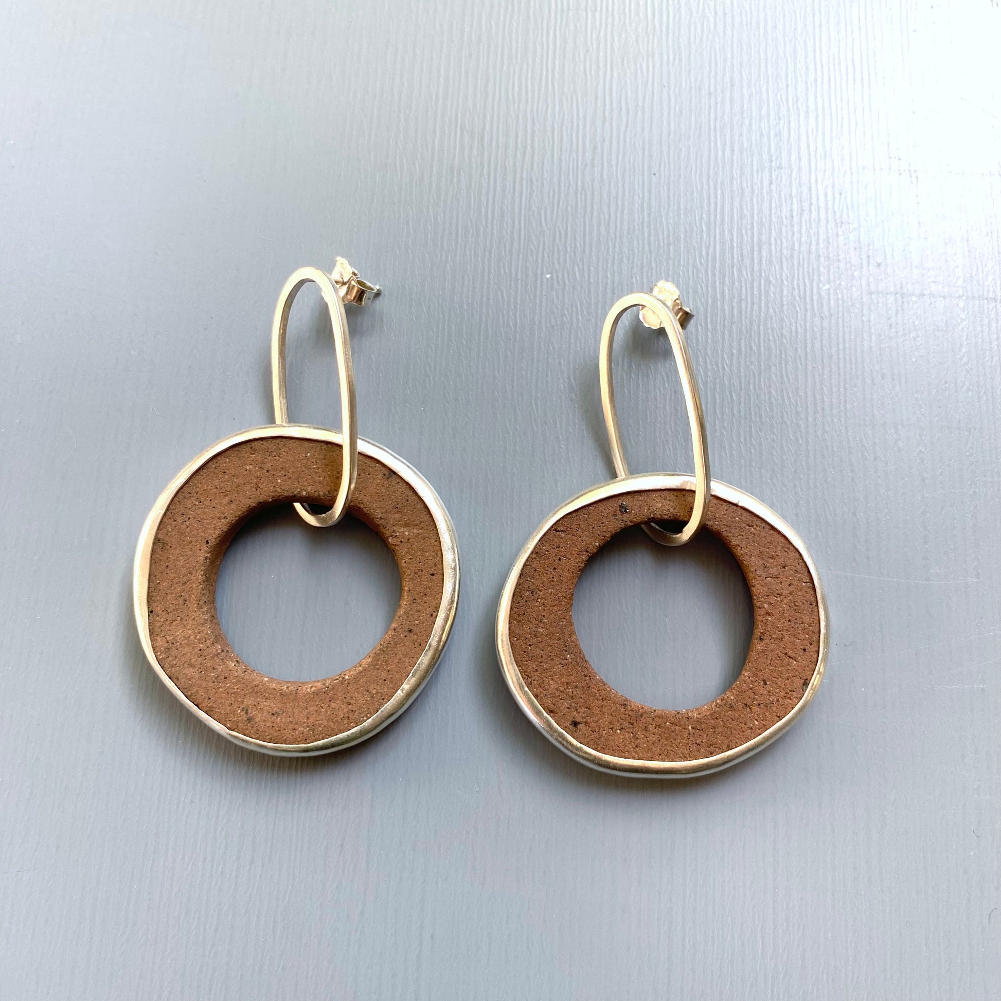 Grandes discos de cerámica o porcelana, engastados con plata pura. Argolla ovalada y tope de plata 950.