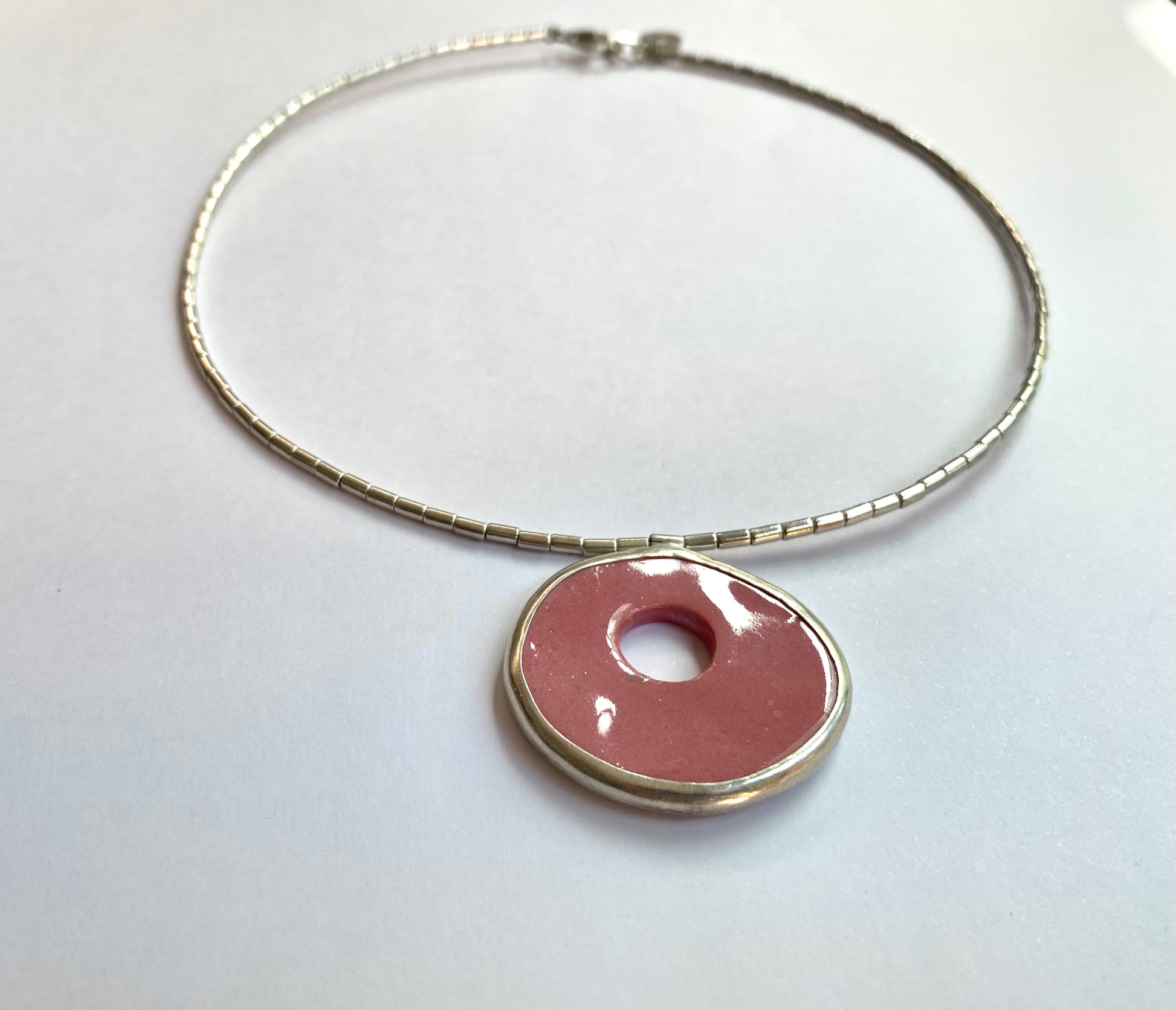 Disco único de cerámica engastada con plata pura, mostacillas y broche de plata 950