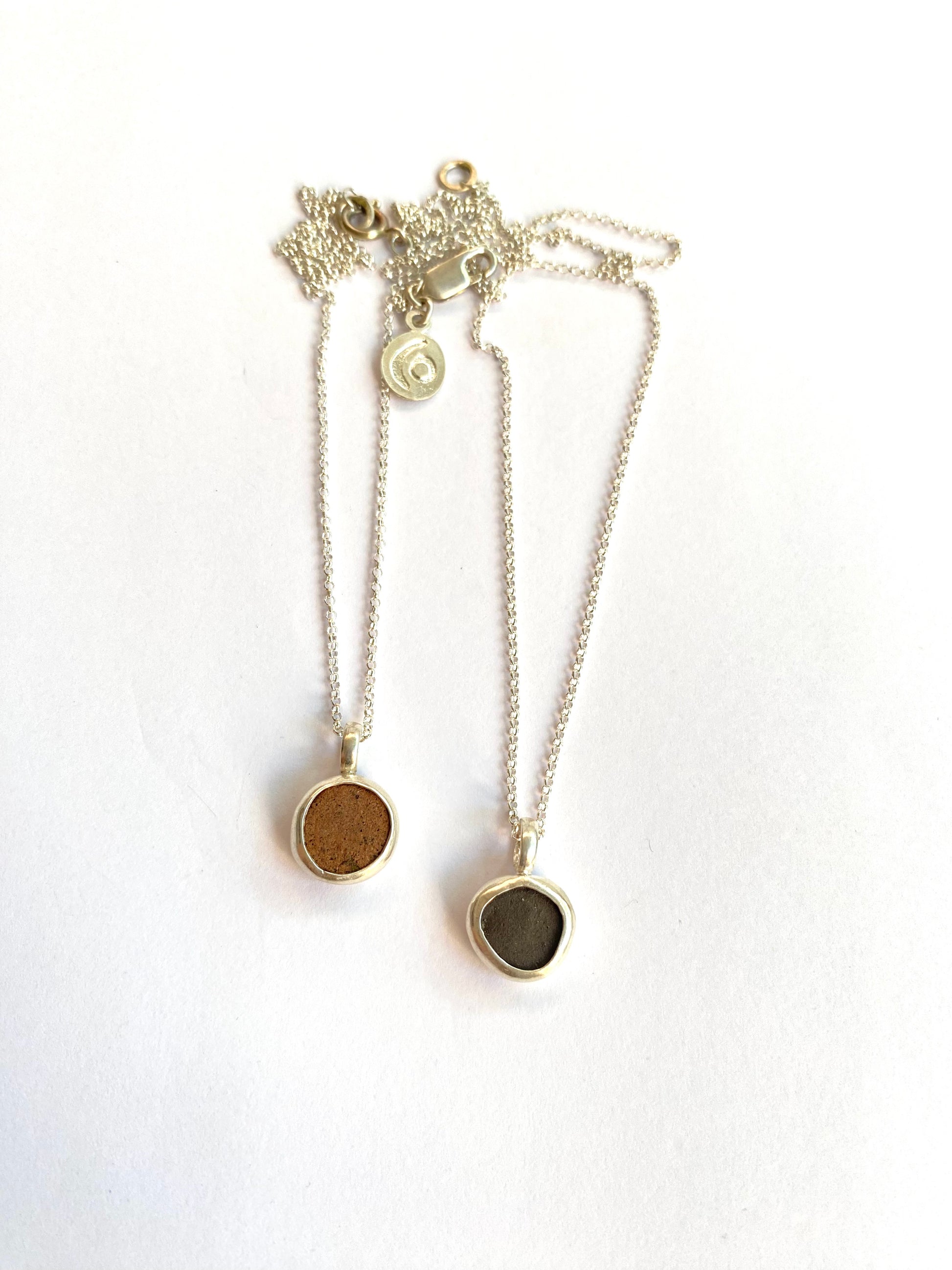Círculo pequeño de porcelana o cerámica engastado en plata, con cadena de plata.
