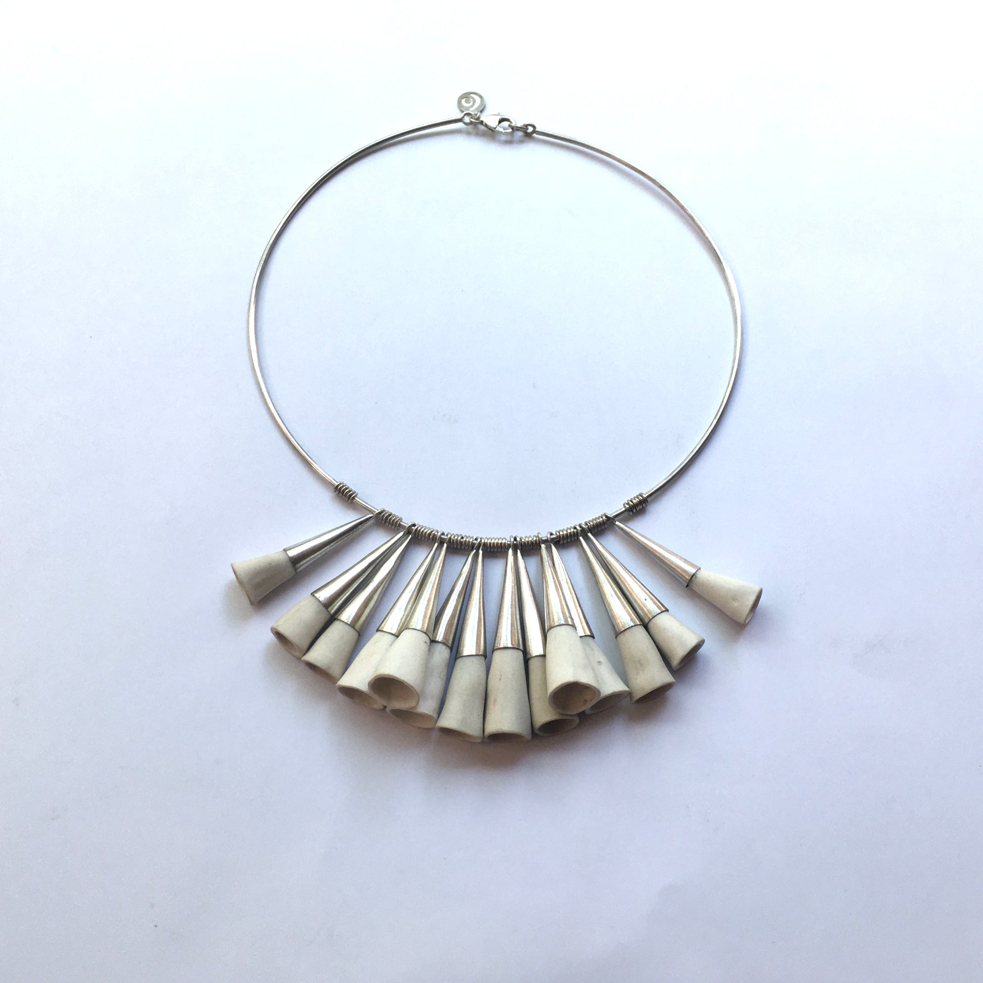 Collar, racimo de 14 conos de porcelana y plata 950, cuello de alambre sólido y original cierre de emboque.
